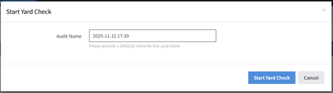 The user will see a new pop up window, where the Audit Name field is. This field comes prepopulated with the date and time the Yard Check is being started at, but the user can alter that to any text if needed. This name will be used to reference the yard check in lookups and reports.