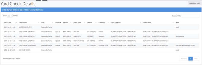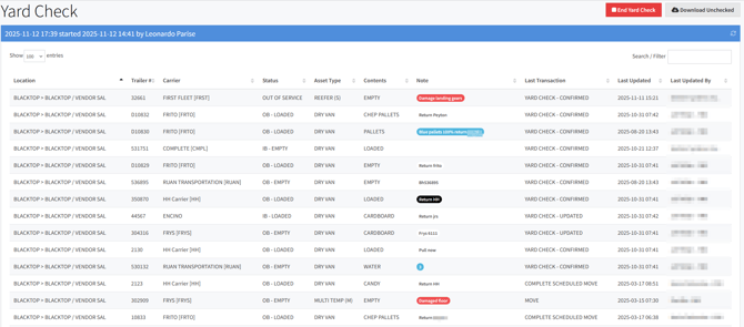 Clicking any of the reports will open a detailed list view of every action done during the Yard Check, including updates and confirmations, as well as the start and end of the Yard Check.