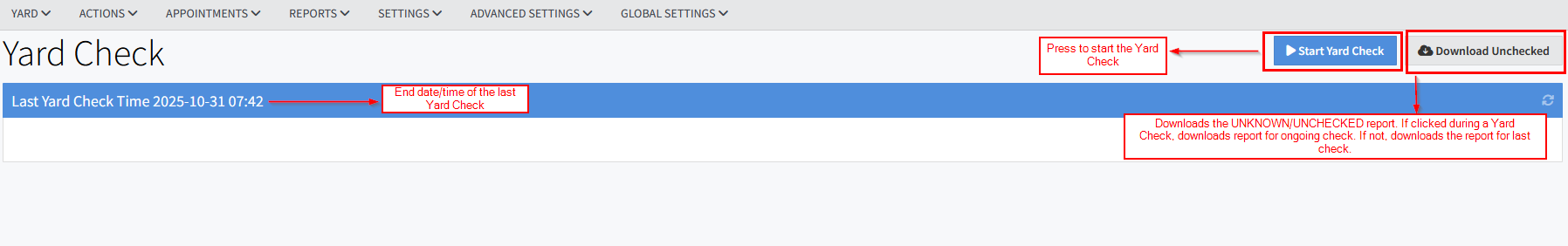 The "Download Unchecked" button will save the UNKNOWN/UNCHECKED report (this same report is available at the end of a Yard Check). If clicked before the start of a Yard Check it will download the previous Yard Check's report. If clicked during an ongoing Yard Check, it will then download the current one.