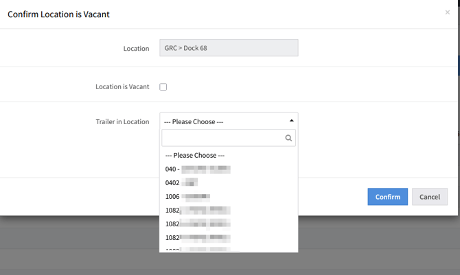 However, if there is an asset at the location, you will need to uncheck the "Location is Vacant" checkbox and select the asset number at the location within the list provided (see picture below).