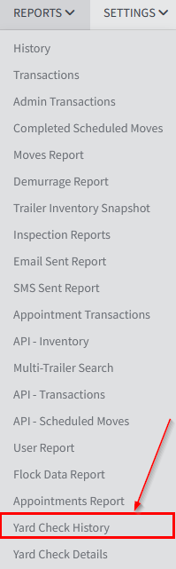 To verify the Yard Check report, go to the "Reports" menu and click Yard Check History.